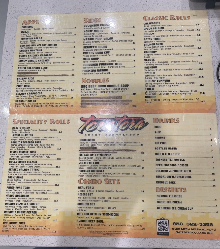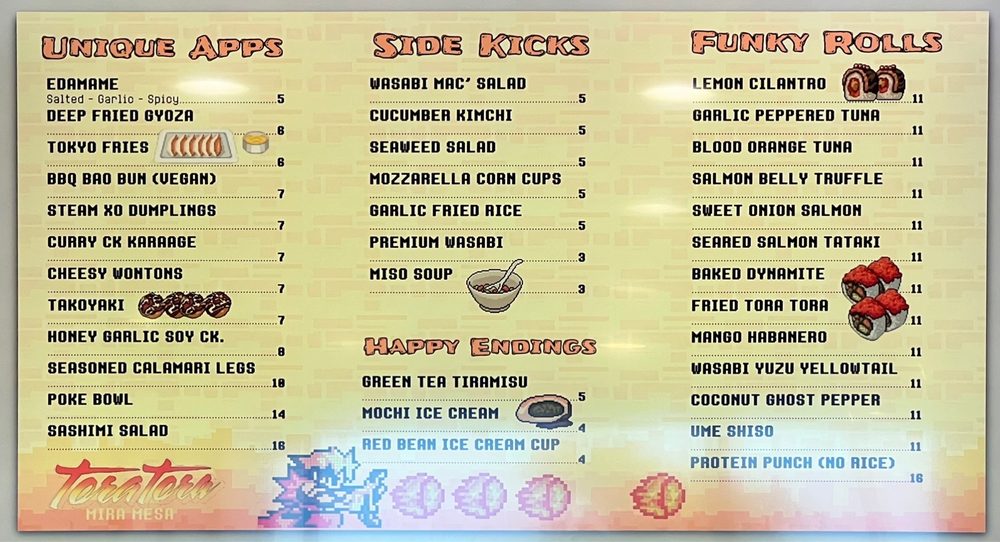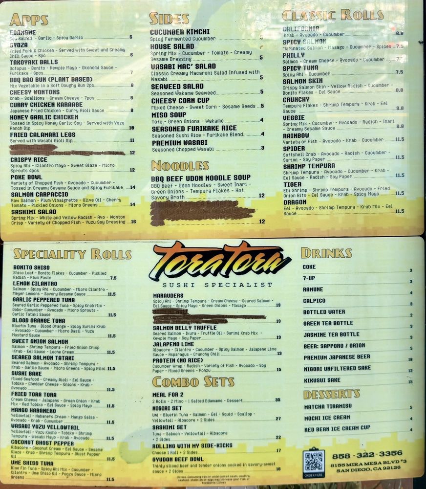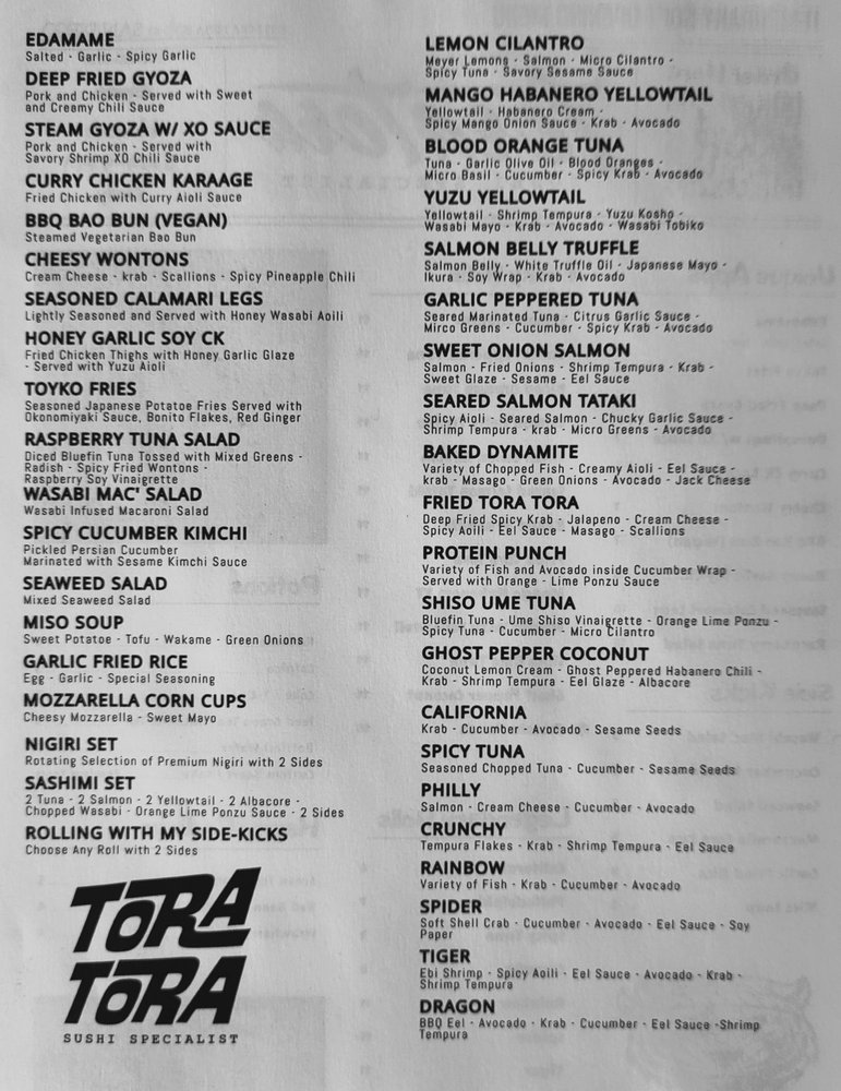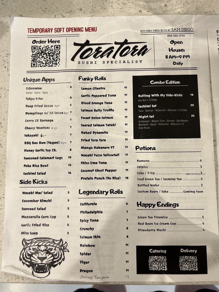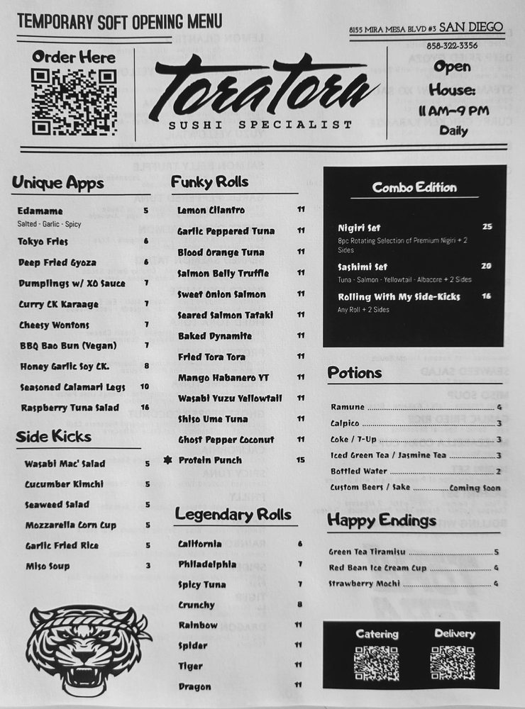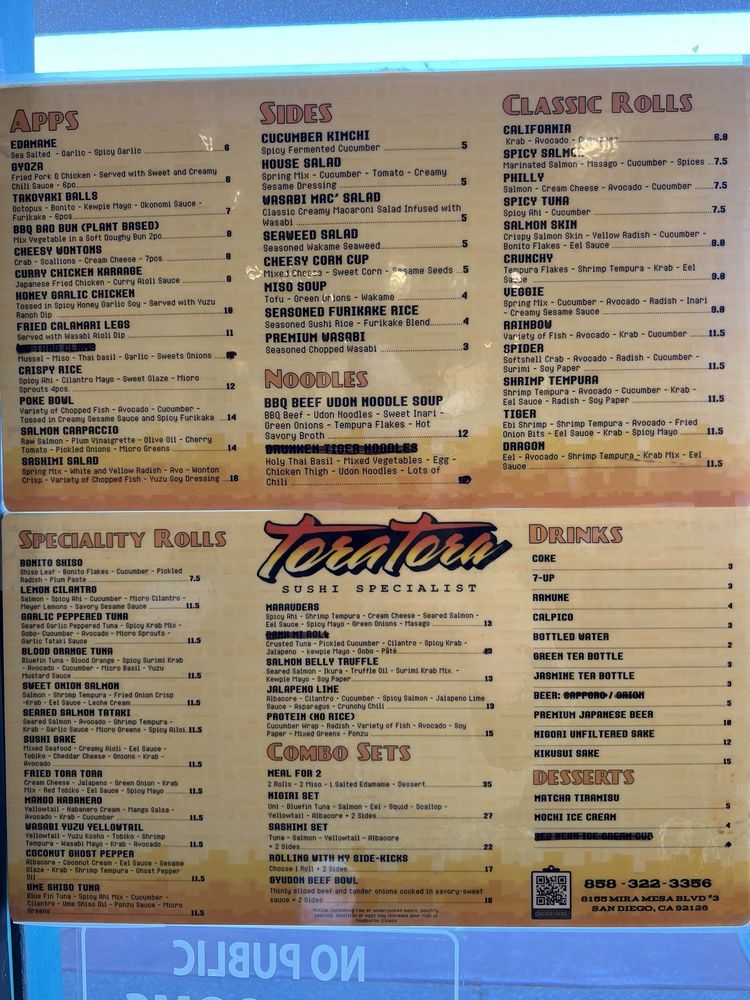 Introducing the menu at Tora Tora Sushi, a casual and trendy Japanese sushi bar in San Diego. The extensive menu includes a variety of Nigiri and Sashimi options such as Albacore, Bluefin Tuna, and Salmon. Appetizers like BBQ Bao Buns, Cheesy Wontons, and Curry Chicken Karaage provide a delicious start to your meal. Customers rave about the fresh and flavorful rolls, with highlights like the truffle salmon roll and crispy rice. The generous portions and budget-friendly prices make it a favorite spot for lunch or dinner. The friendly staff and cozy atmosphere add to the overall dining experience, making Tora Tora Sushi a must-try destination for sushi lovers in the area.